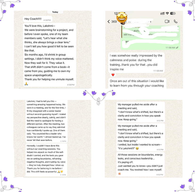 I am Lakshmi — a Leadership Coach with 20+ years of experience in HR consulting, L&D, and organizational development. I work with ambitious mid-career women who are ready to move from self-doubt to self-leadership— and show up with clarity, confidence, and authority.